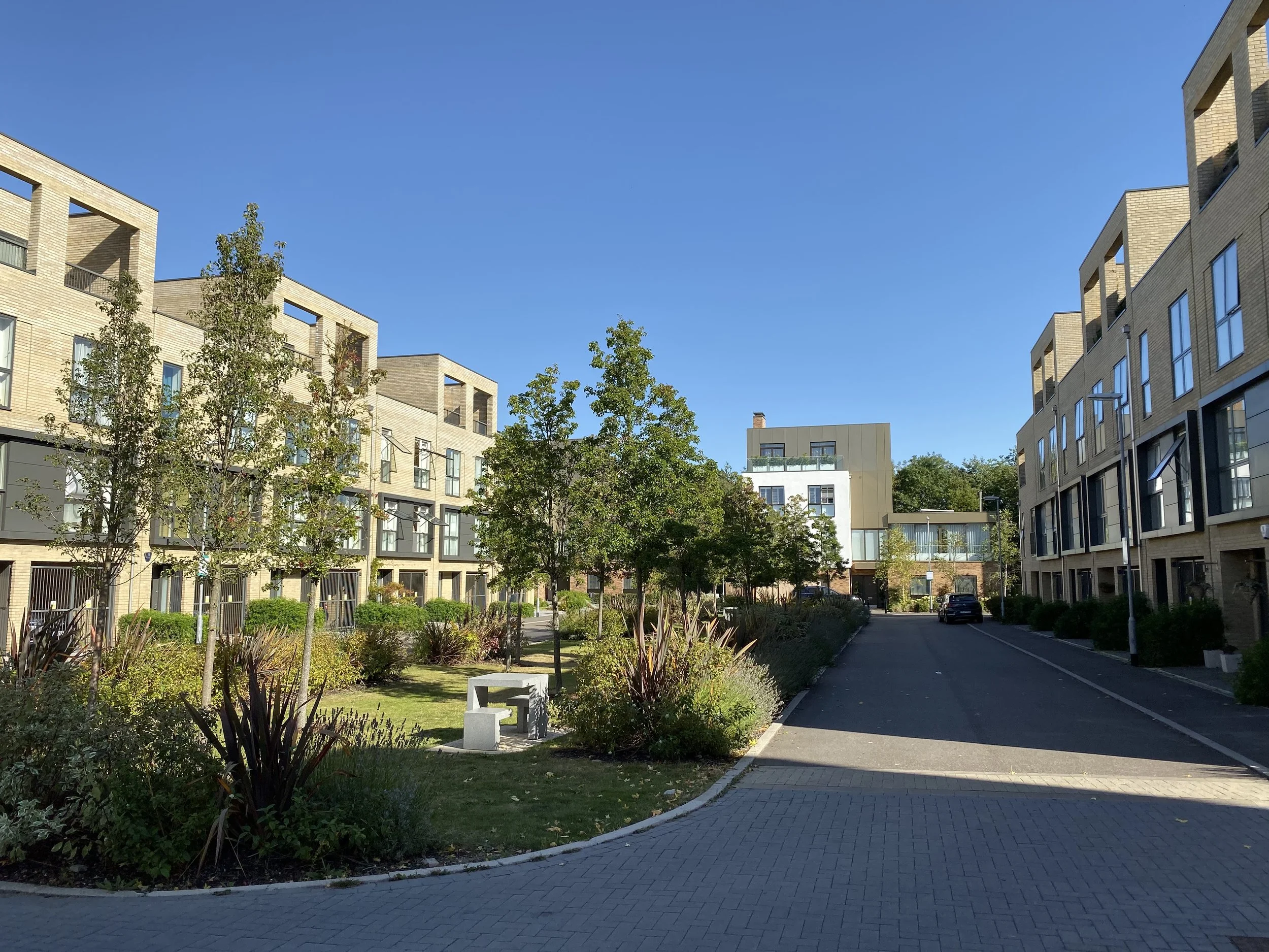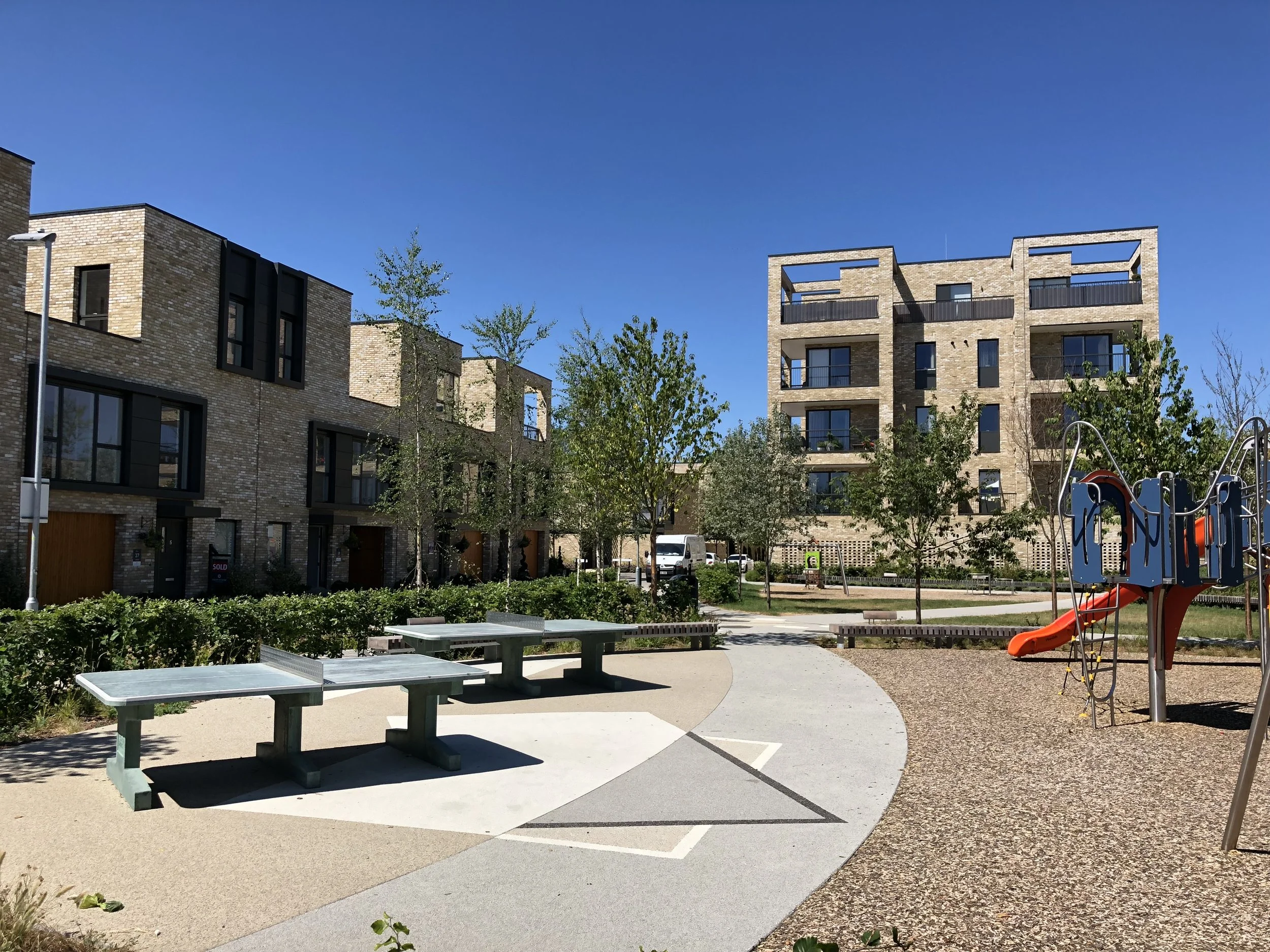 New Commercial retail facilities sit below blocks of apartments at the centre of the development. A new public space created between the blocks provides a largely traffic free link between the immediately adjoining Hobsons Square and Clay Farm Centre community building and the New country park and Cambridge Biomedical Campus beyond.
