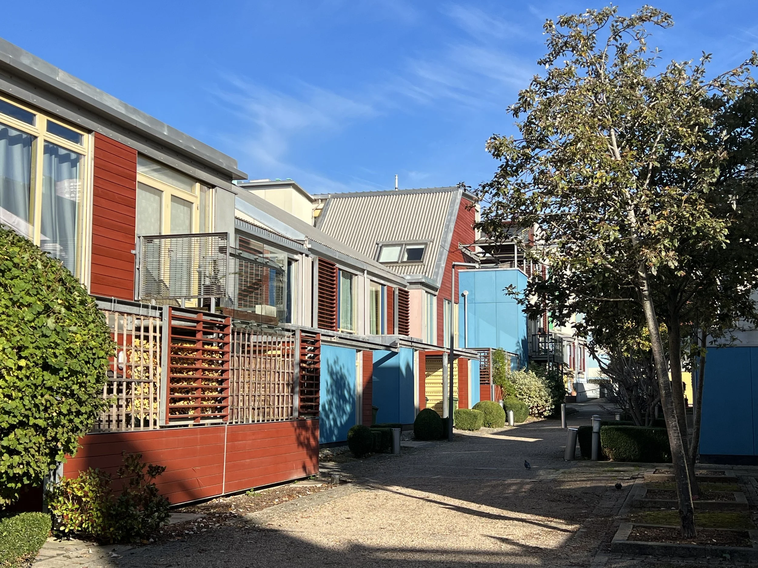 The scheme employs a number of what were at the time innovative firsts including the use of a detailed design code to govern the character of streets, spaces and buildings, a variety of MMC techniques including on site factory made and volumetric components, materials that sought to reduce embodied carbon, Community Heating systems powered by Combined Heat and Power plants, reuse of heavily contaminated brownfield land and shared courtyard gardens and traffic free spaces managed by a site based resident owned and controlled management company.